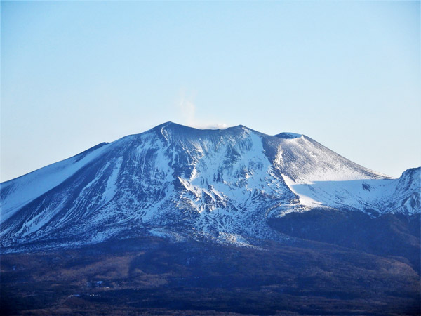北北東に約19㎞離れた場所から見た浅間山です。噴気も見えているようです。その下の出っ張りが千トン岩です。