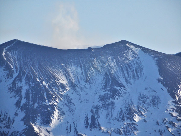 千トン岩が写真中央少し上、火口の淵の低くなっている場所にモニュメントのように鎮座しています。南側の火口縁が噴気の背後に見えているのは、写真を遠方のやや高い所(1080m)から撮影したためと考えられます。
